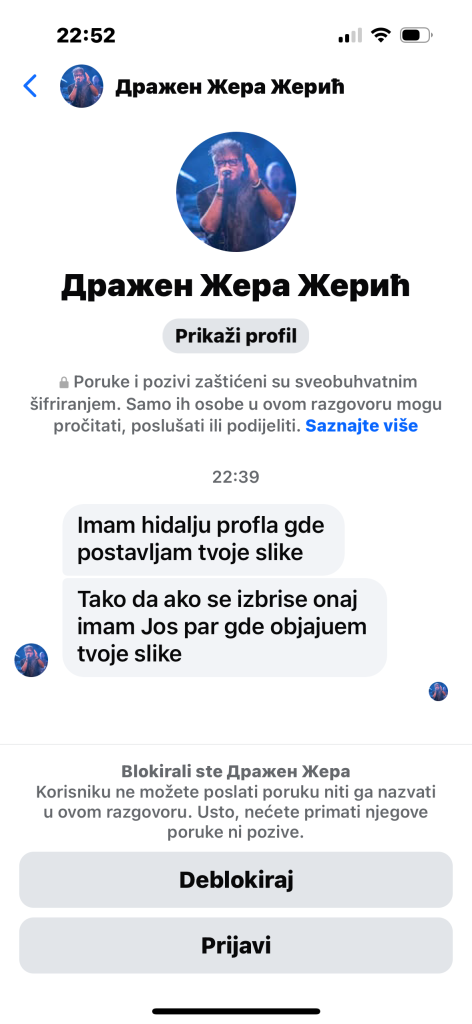 Osoba krade moje slike (crvke, manastiri, priroda …) koje su potpisane i zaštićene autorskim pravima i objavljuje ih na svom lažnom profilu. Osoba je izjavila da će obrisati fotografije, ali to nije učinila, već me je blokirala. Profil je prijavljen nadležnim službama. Pored tog profila, pojavio se još jedan sličan. Napominjem da buduće objave koje se tamo budu objavljivale nemaju veze sa mnom.